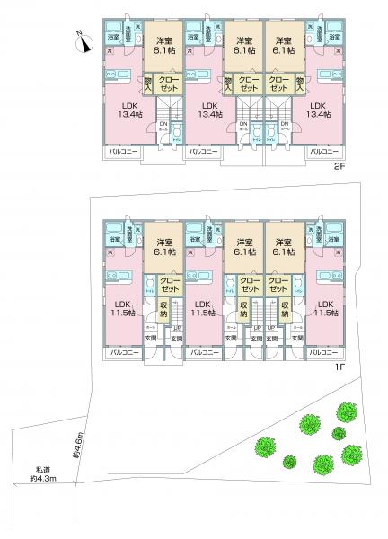 | 備考・特記事項 | 土地面積計測方式:公簿、土地面積:399.04㎡、私道負担面積:49.12㎡、私道負担割合:64/80、容積率:80%、敷地全体面積:399.04㎡、専有面積詳細:43.37㎡~51.02㎡ ※掲載内容と現況が異なる場合は、 現況を優先いたします。 | ||