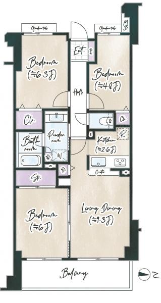 | 専有面積 | 65.13㎡ | バルコニー面積 | 8.7㎡ |