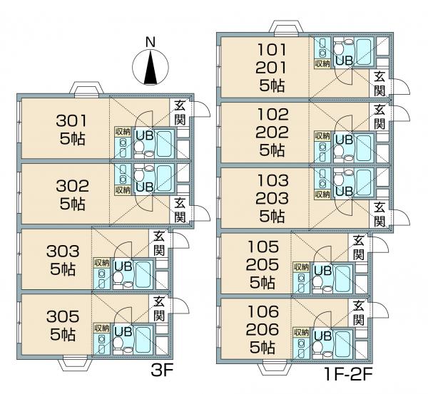 | 間取り | 洋室5畳・1階・5室 / 洋室5畳・2階・5室 / 洋室5畳・3階・4室 | ||