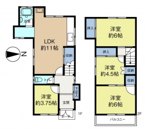 - 間取り:4LDK LDK11畳 / 洋室6畳 / 洋室6畳 / 洋室4.5畳 / 洋室3.75畳